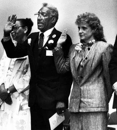 1989: Disaster Strikes! Whoah, the '80s really end on a sour note for Miers' hair, and how about that double-breasted suit? Is she trying to look like a member of REO Speedwagon or something?